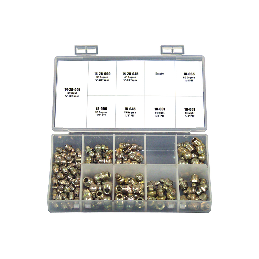 This kit allows technicians and mechanics to carry a versatile set of grease fittings to quickly service bearings, joints, and lubrication points without delay. Housed in a compact, organized case (or kit box), it's suitable for mobile service vans or fixed tool rooms.