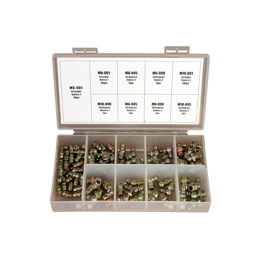 The American Lubrication Equipment 4451 is a 110-piece metric grease fitting assortment engineered for precision lubrication in automotive, industrial, and agricultural machinery. This professional kit contains a balanced mix of metric fittings — including M6, M8, and M10 thread types — in multiple angles (straight, 45°, and 90°) to suit a variety of lubrication access points.