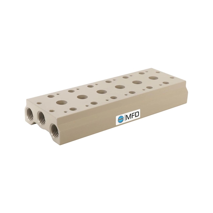 Aluminum modular sub-base manifold for MFD/M4* valves; simplifies plumbing and valve mounting. Station count: 6 . Common supply/exhaust galleries