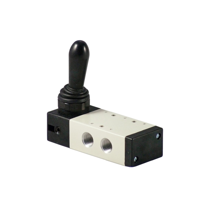 Manual hand-lever actuated spool valve, 1/4" ports/size. Often used for jog/manual operations