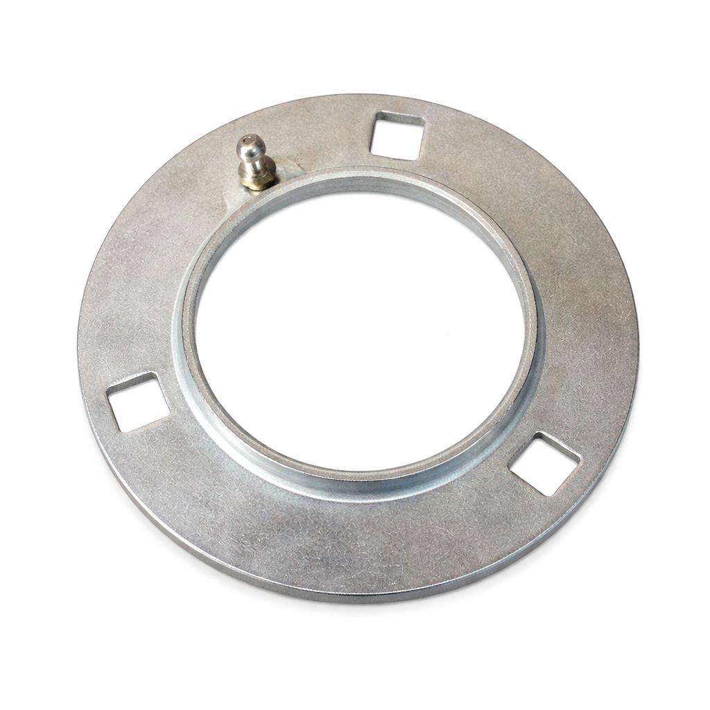 Stamped steel, greaseable (relubricatable) flangette housing for agricultural ball bearings. Designed to fit relube-style insert bearings with an approximate 72 mm bearing O.D. (commonly 200 series applications). Typically supplied/used as a pair of housing halves to capture the bearing outer race and provide a 4-bolt flange mount. Specs: MPN G72MSA.