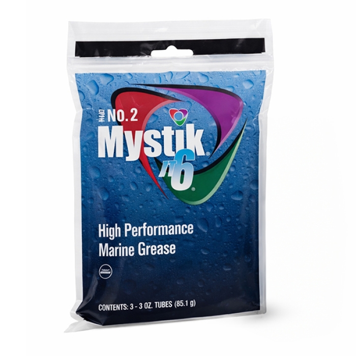 Mystik JT-6 High-Performance Marine Grease is a smooth, tacky blue grease designed for outstanding water resistance in wet-environment applications. This listing specifies NLGI #2, a 3 oz tube container, and a 3-pack configuration.
