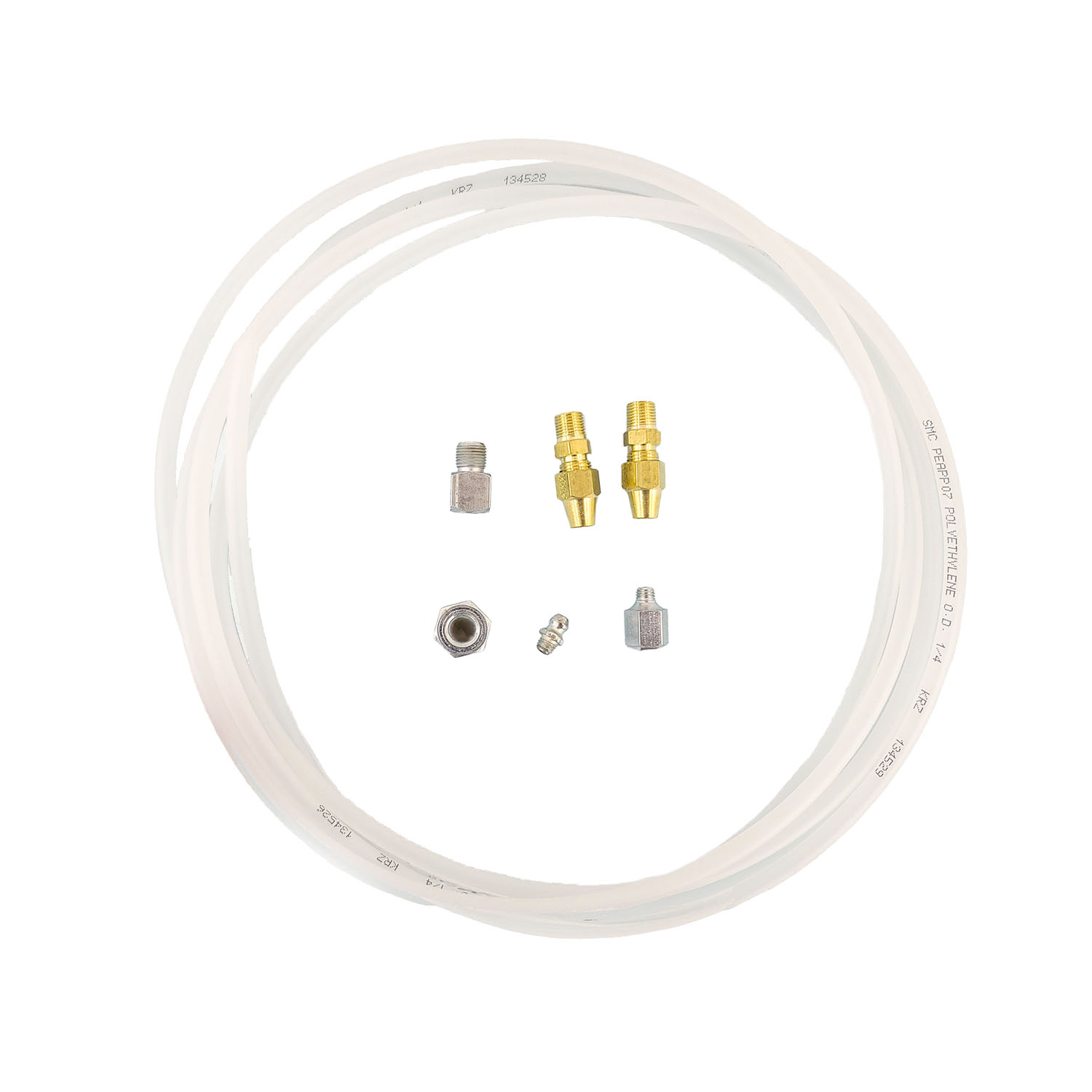 10' of 1/4" polyethylene tubing, bulkhead fitting, grease fitting, adapter, two male connectors, versatile application, ease of installation.