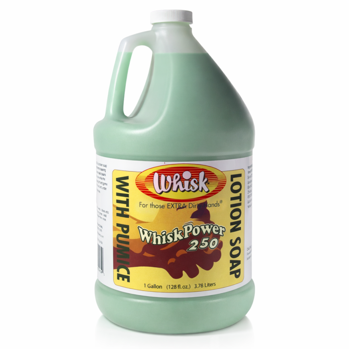 Whisk WhiskPower Lotion Soap (WP-250-SN-4) is designed for commercial and industrial facilities and features 1.0 gal short neck bottle, lotion formula, green appearance, and made with Pumice. It is a solid choice for washrooms, maintenance areas, workshops, and other locations that need dependable hand cleaning products.
